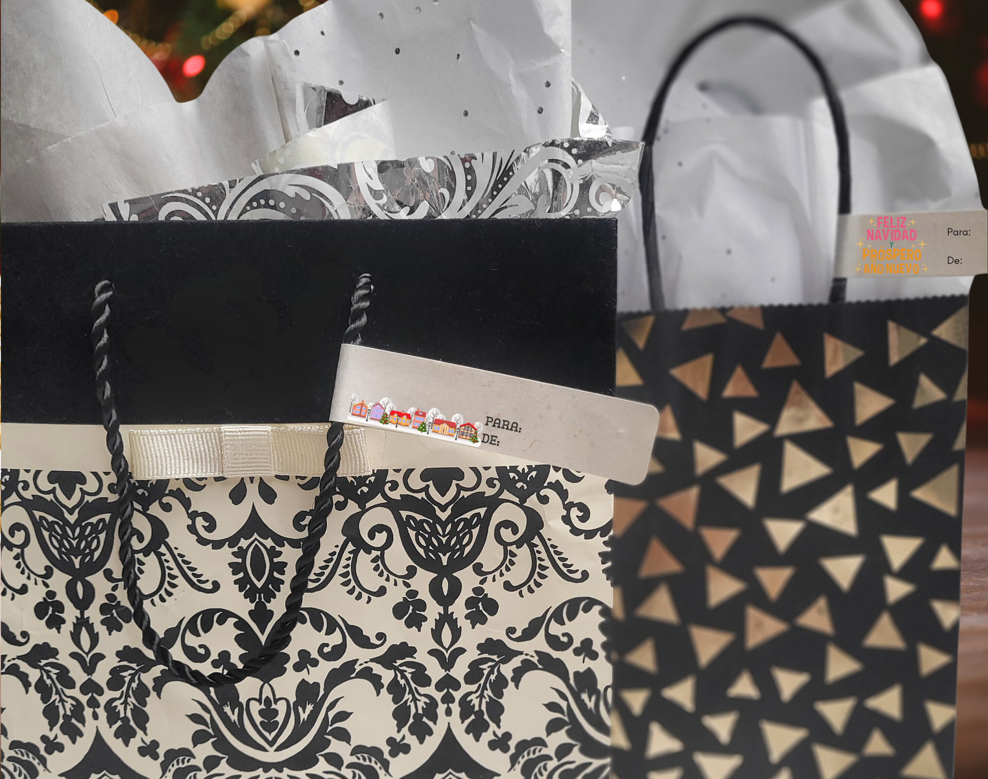 - Diseño único para usar saludos en las asas de las bolsas de regalo